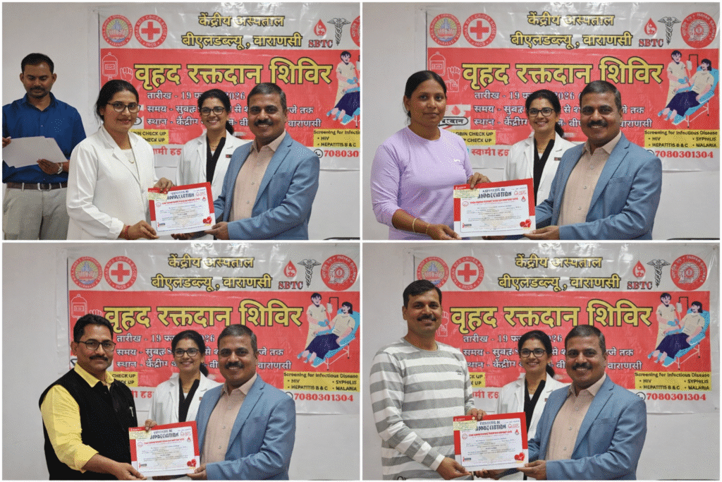 बनारस रेल इंजन कारखाना (बरेका), वाराणसी के केंद्रीय चिकित्सालय में 19 फरवरी 2026 को वृहद स्वैच्छिक रक्तदान शिविर आयोजित किया गया। महाप्रबंधक के दिशा-निर्देशन और डॉ. देवेश कुमार के नेतृत्व में आयोजित इस शिविर में 30 लोगों ने रक्तदान किया। महिलाओं की सक्रिय भागीदारी रही, जिसमें श्रीमती सीमा ने 42वीं बार रक्तदान कर प्रेरणादायक उदाहरण प्रस्तुत किया। इस शिविर ने मानव सेवा, सामाजिक जिम्मेदारी और रक्तदान जागरूकता का मजबूत संदेश दिया।