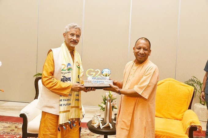 मुख्यमंत्री योगी आदित्यनाथ ने विदेश मंत्री डॉ. एस जयशंकर से जी-20 बैठक के बाबत जानकारी की। इस दौरान मुख्यमंत्री ने विदेश मंत्री को जी-20 का अंगवस्त्रम पहनाकर व लोगो स्मृति चिन्ह स्वरूप भेट की।