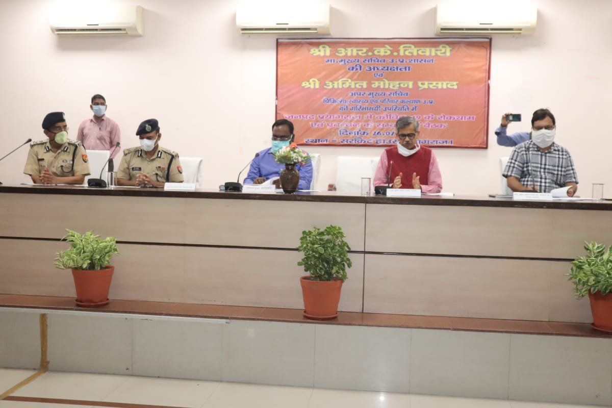 प्रयागराज। मुख्य सचिव राजेन्द्र कुमार तिवारी की अध्यक्षता में सर्किट हाउस के सभागार में कोविड-19 की रोकथाम एवं प्रबंधन के सम्बंध में समीक्षा बैठक आयोजित की गयी है। बैठक में मुख्य सचिव ने स्वास्थ्य विभाग सहित सभी सम्बंधित विभागों के अधिकारियों को कोविड-19 के संक्रमण को प्रभावी ढंग से नियंत्रित करने के लिए ज्यादा से ज्यादा टेस्ट कराये जाने का निर्देश दिया है। उन्होंने कहा कि जितना अधिक से अधिक टेस्टिंग की सुविधा होगी, कोरोना संक्रमण के प्रसार को उतनी ही जल्दी से नियंत्रित किया जा सकेगा।