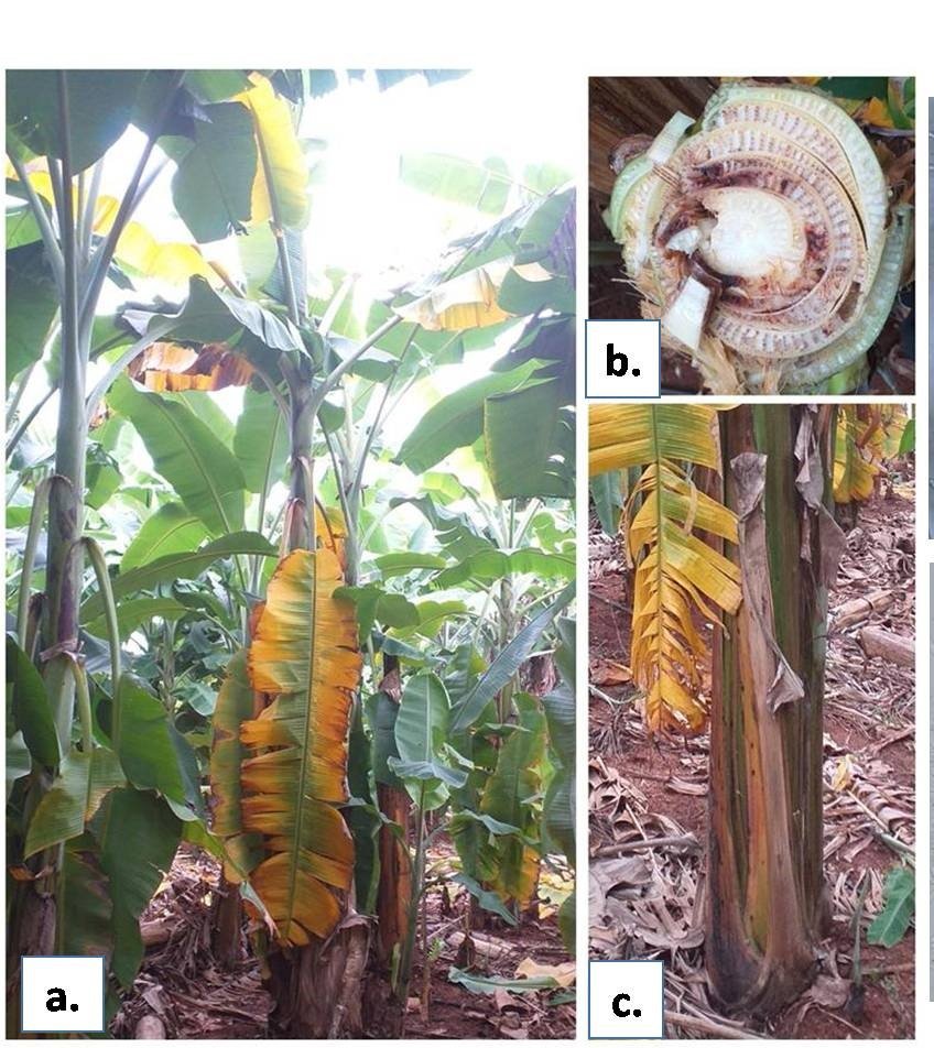 रोग का संक्रमण केले के तने के भीतरी भाग में होता है। संक्रमित केले के पौधे के तने का भीतरी हिस्सा क्रीमी कलर का न होकर कत्थई या काले रंग का हो जाता है।