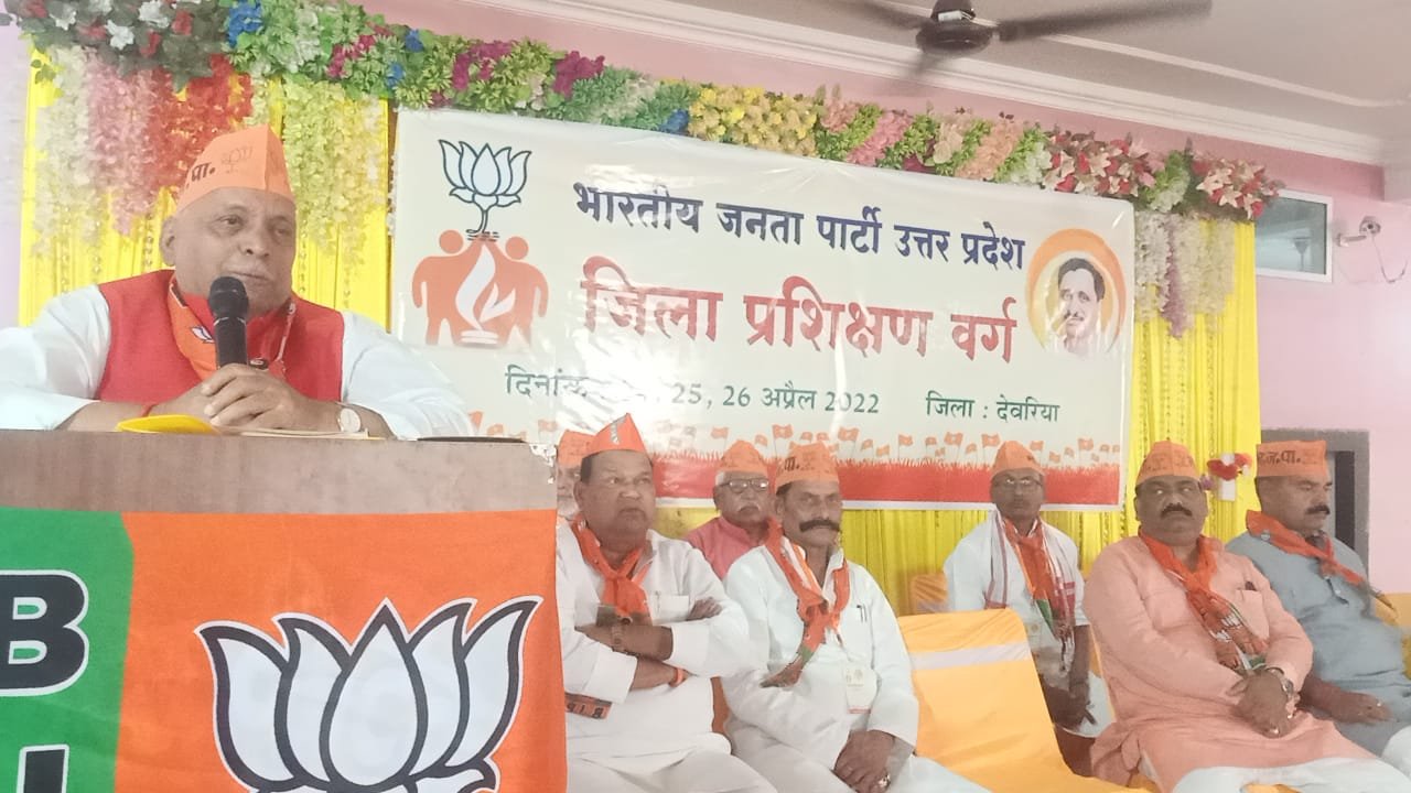 देवरिया । सोन्दा के शौर्य मैरेज हाल में रविवार को भारतीय जनता पार्टी का तीन दिवसीय प्रशिक्षण शिविर प्रारंभ हुआ, जिसमें जनपद के सभी कार्यकर्ता व पदाधिकारी शामिल हुए। प्रशिक्षण शिविर का उद्घाटन सत्र पूर्व प्रदेश अध्यक्ष, सांसद देवरिया सदर डा. रमापतिराम त्रिपाठी ने भारत माता, दीनदयाल उपाध्याय व श्यामाप्रसाद मुखर्जी के चित्र के सम्मुख दीप प्रज्जवलित व माल्यार्पण कर किया। प्रथम सत्र में सदर सांसद डा. त्रिपाठी ने “भाजपा की जनसंघ की स्थापना से लेकर वर्तमान भाजपा की यात्रा व इतिहास” अर्थात “भाजपा इतिहास एवं विकास” के बारे में विस्तार से बताया। सदर सांसद ने कहा कि 1951में डाॅ श्यामा प्रसाद मुखर्जी ने जनसंघ की नींव रखी। बाद में पं दीनदयाल उपाध्याय जैसे महापुरुषों ने अपनी सोच एवं परिकल्पना के आधार पर इसे आगे बढाया। 1980 में बनी भारतीय जनता पार्टी को अटल बिहारी वाजपेयी जैसे मनीषियों का नेतृत्व मिला और आज नरेंद्र मोदी जैसे मजबूत एवं सटीक निर्णय लेने वाले प्रधान सेवक के बदौलत पुरे विश्व में भारत का मान सम्मान एवं गौरव बढा़।