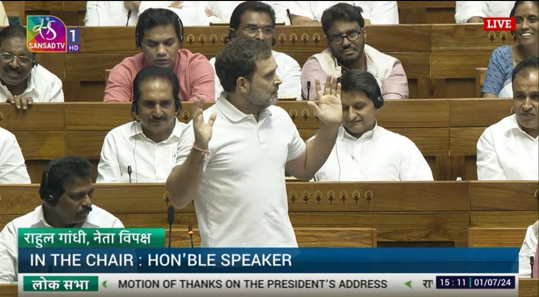 लोकसभा में विपक्ष के नेता (एलओपी) के रूप में राहुल गांधी का सोमवार को पहला भाषण था। इस दौरान सदन में भारी हंगामा हुआ। अपने भाषण की शुरुआत करते हुए कांग्रेस सांसद ने संविधान की एक प्रति और भगवान शिव की तस्वीर लहराई और सत्तारूढ़ भारतीय जनता पार्टी (भाजपा) और राष्ट्रीय स्वयंसेवक संघ (आरएसएस) पर निशाना साधा।राहुल गांधी द्वारा हिंदुओं का उल्लेख करने पर भाजपा सांसदों ने कड़ा विरोध किया और प्रधानमंत्री नरेंद्र मोदी ने भी इस दौरान हस्तक्षेप किया। कांग्रेस सांसद को टोकते हुए प्रधानमंत्री मोदी ने कहा था, पूरे हिंदू समुदाय को हिंसक कहना बहुत गंभीर मामला है।