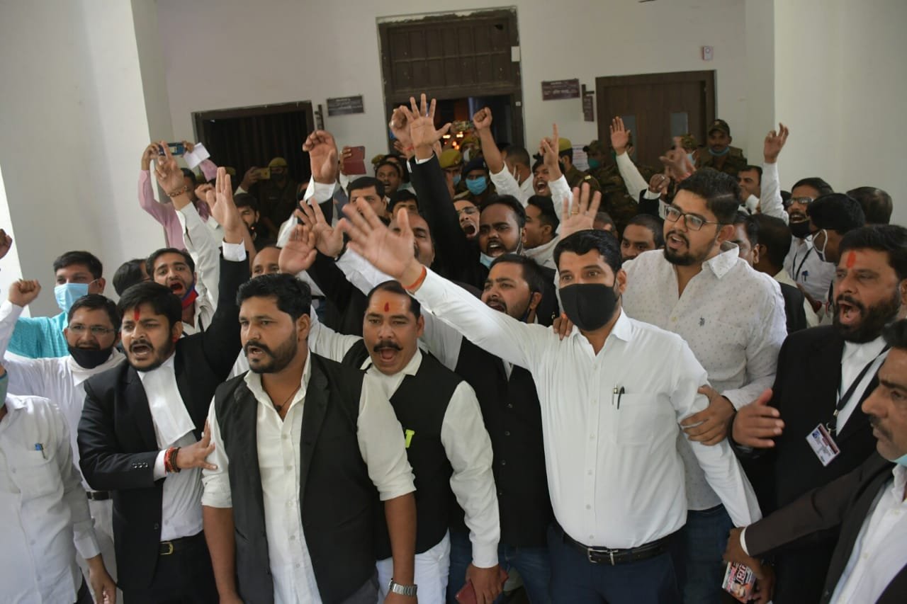 वाराणसी। बीते दिनों एसएसपी ऑफिस पर बिना मास्क के समूह में पहुंचे वकीलों के खिलाफ कैंट थाने में दर्ज मुकदमे को लेकर शनिवार को वकीलों ने डीएम तथा एसएसपी ऑफिस पर जमकर नारेबाजी करते हुए प्रदर्शन किया। इससे पूर्व इस मुद्दे पर घनश्याम सिंह तथा रंजन मिश्र द्वारा दिए गए प्रस्ताव पर सेंट्रल बार एसोसिएशन में वकीलों ने बैठक कर पुलिस की कार्रवाई पर असंतोष जताते हुए विरोधस्वरूप न्यायिक कार्य से विरत रहने का निर्णय लिया।