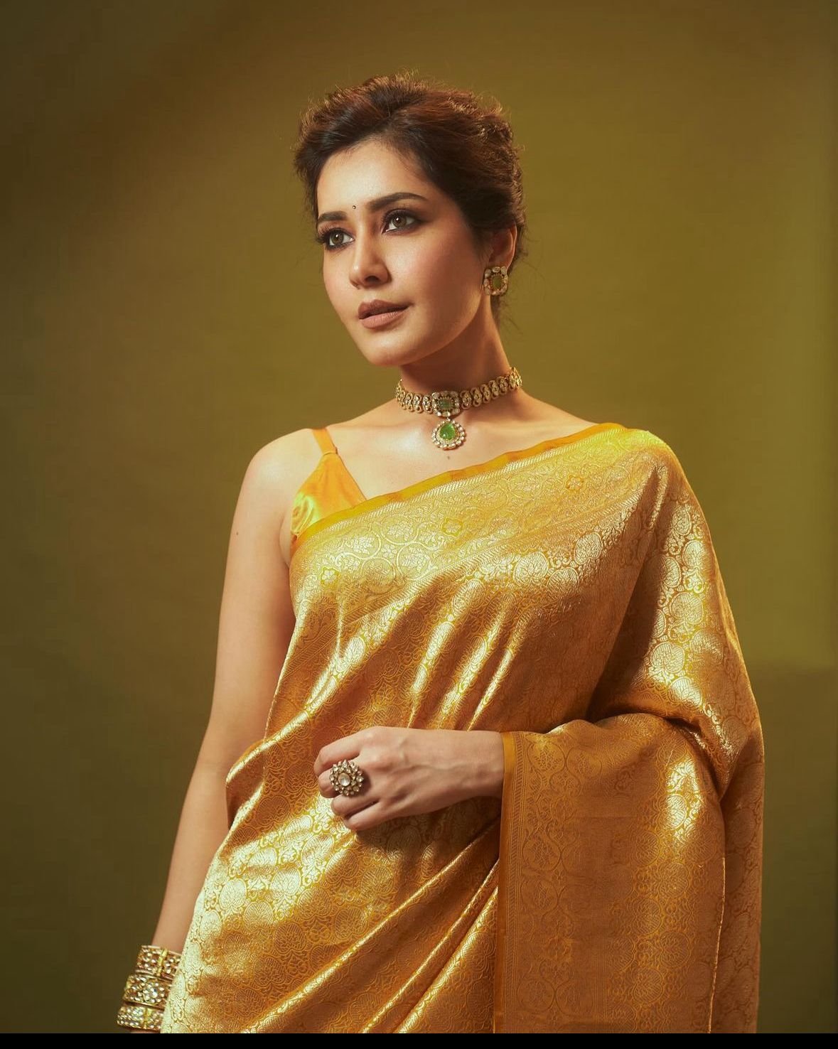 राशि खन्ना ने गोल्ड साड़ी में अपनी कुछ तस्वीरें साझा कीं जिनमें, वह किसी क्वीन से कम नहीं लग रही थीं। इस ऑउटफिट में रॉयल वाइब्स दिखाने वाली एक्ट्रेस ने पोस्ट को कैप्शन के साथ साझा किया, जिसमें लिखा था, “ड्रेप्ड इन ए गोल्डन ड्रीम।”