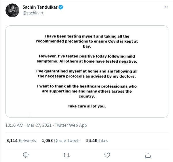 कोरोना की चपेट में आए मास्टर ब्लास्टर, ट्विटर पर दी जानकारी