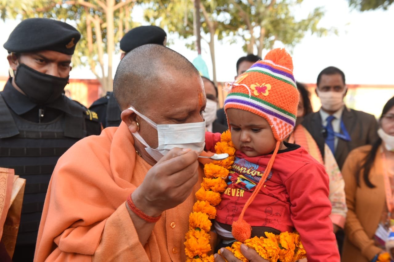 इसके बाद योगी ने दो बच्चों का अन्‍नप्राशन कराया। चार महिलाओं की गोद भराई की रस्म अदायगी भी पूरी कराई। अन्नप्राशन के दौरान मुख्यमंत्री योगी आदित्यनाथ ने आरूष एवं गौरांशी को गोद में उठाकर खूब दुलारा। गोद भराई के दौरान उन्होंने धात्री महिलाओं से कहा कि फल व सब्जियां खाना शुरू कर दें और घरों में सब्जियां उगाएं।