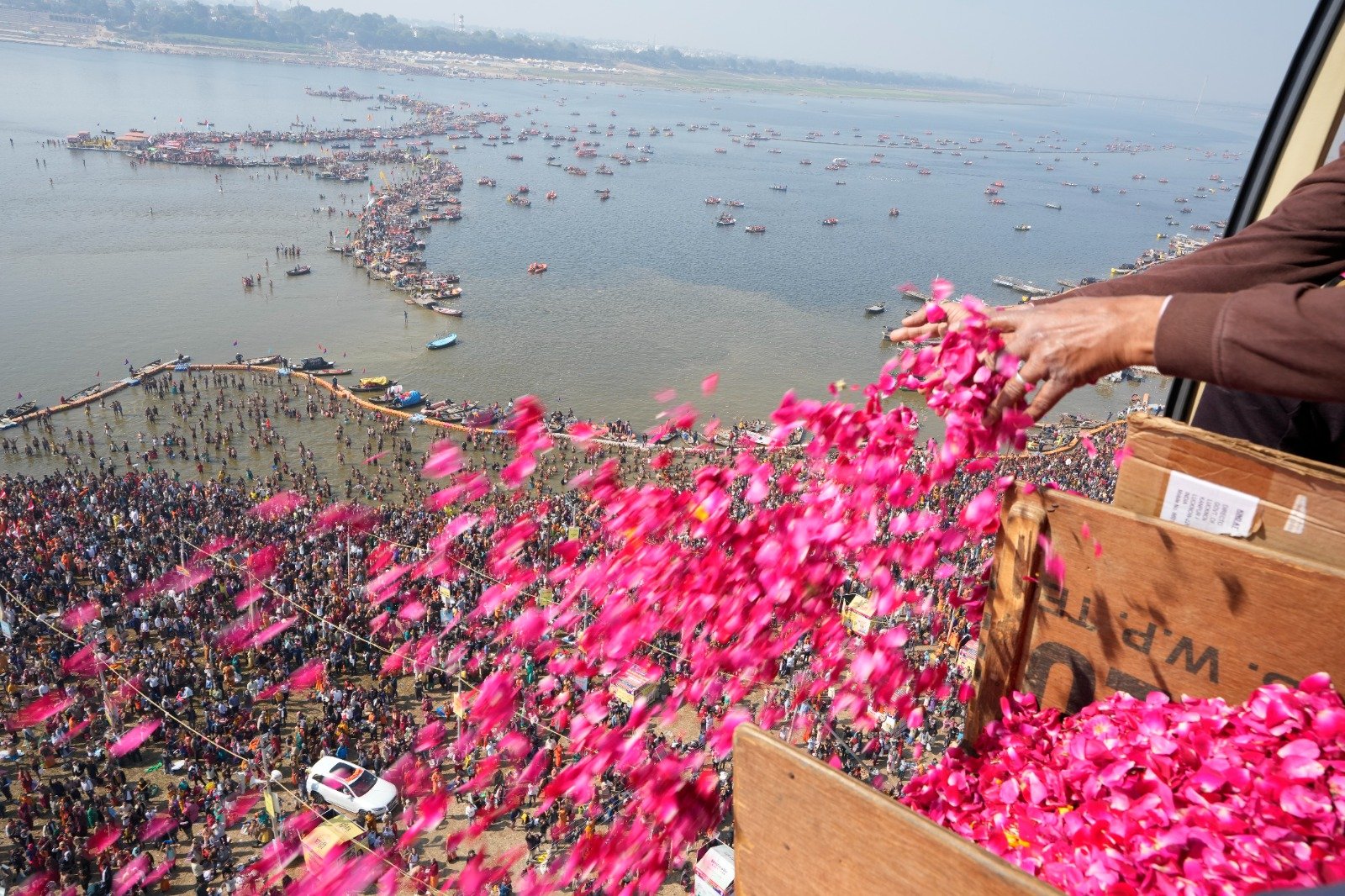 माघ मेला में हेलीकाप्टर से हुई श्रद्धालुओं पर पुष्प वर्षा