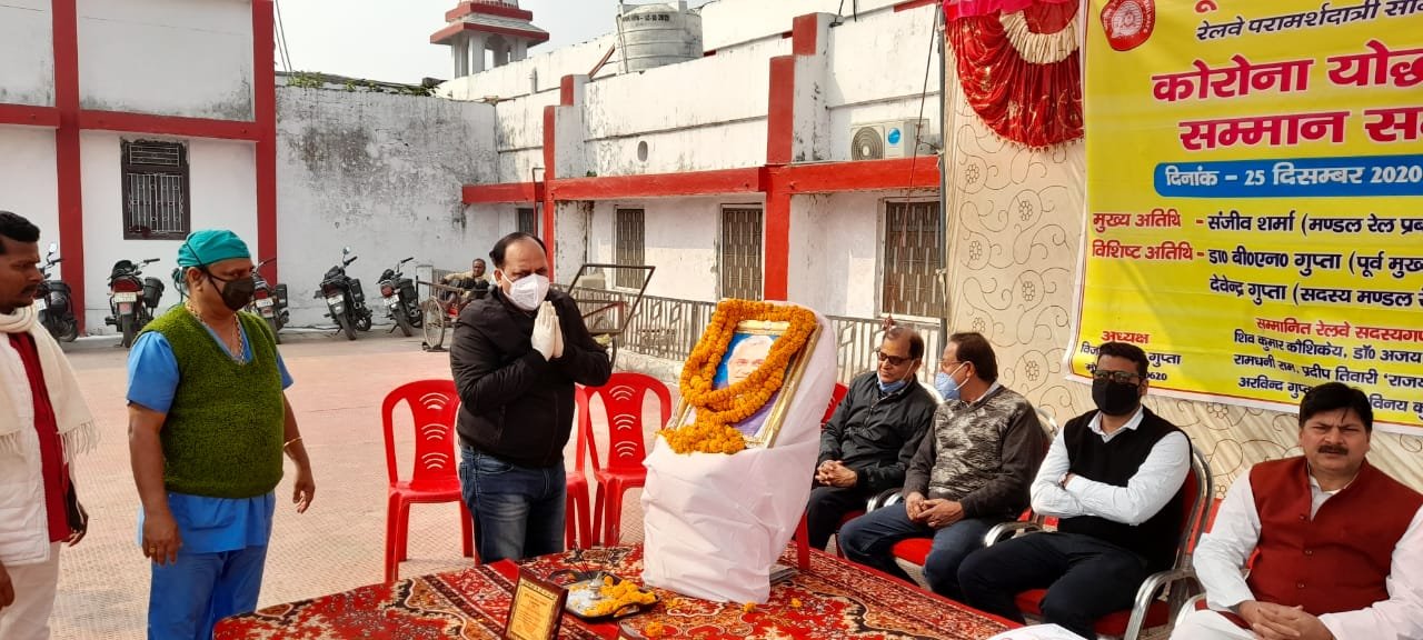 पूर्वोत्तर रेलवे वाराणसी रेलवे परामर्शदात्री समिति बलिया जनपद में कोरोना वायरस के संक्रमण के नियंत्रण में शासन प्रशासन के साथ साथ अपने निजी संसाधन द्वारा समाज मे चढ़ बढ़ कर किये गए सहयोग के क्रम में आज भारत रत्न व पूर्व प्रधानमंत्री के जन्मदिन पर उत्कर्ष कार्य करने वाले रेलवे के वाणिज्य, यातायात, रेलवे सुरक्षा बल,जीआरपी व मेडिकल व समाज के कोरोना नियंत्रण के कर्मयोगी को सम्मान पत्र देकर सम्मानित किया गया। सर्व प्रथम मुख्य अतिथि बरिष्ठ मंडल वाणिज्य प्रबंधक संजीव शर्मा व विशिष्ट अतिथि जेडआरयूसीसी मेम्बर व भाजपा पिछड़ा वर्ग मोर्चा प्रदेशकार्यसमिति सदस्य देवेन्द्र कुमार गुप्त ने संयुक्त रूप से भारत रत्न व पूर्व प्रधानमंत्री के चित्र पर दीप प्रज्वलित कर पुष्प अर्पित किया।मुख्य रूप से मण्डल रेल वाणिज्य प्रबधक संजीव शर्मा,मण्डल रेल परिचालन रोहित गुप्ता सहित रेलवे सुरक्षा बल,जीआरपी,मेडिकल से जुड़े लोगों को माला पहनाकर प्रशस्ति पत्र देकर सम्मानित किया गया।उक्त कार्यक्रम रेलवे परामर्शदात्री समिति के अध्यक्ष विजय कुमार गुप्ता व सचिव निर्भय नारायण सिंह एडवोकेट के सफल नेतृत्व में रेल परामर्शदात्री के सदस्यों द्वारा सम्मान समारोह आयोजित किया गया। कार्यक्रम में मुख्य रूप से स्टेशन अधीक्षक संजय सिंह, डॉ जेपी शुक्ला, डॉ मनोज कुमार, डॉ दयानन्द सिंह, डॉ अशोक कुमार, डॉ बीएन गुप्ता, इलाहाबाद वि0वि0 के छात्र नेता अजीत सिंह,डीसीआई पीएन मिश्रा, मिलकुभाई रोशन, कुमार कौशिकेय, डॉ अजय मिश्रा, रामधनी राम, प्रदीप तिवारी, ब्यापरिक नेता अरविन्द गुप्ता,संतोष गुप्ता सहित दर्जनों लोगों को सम्मानित किया गया