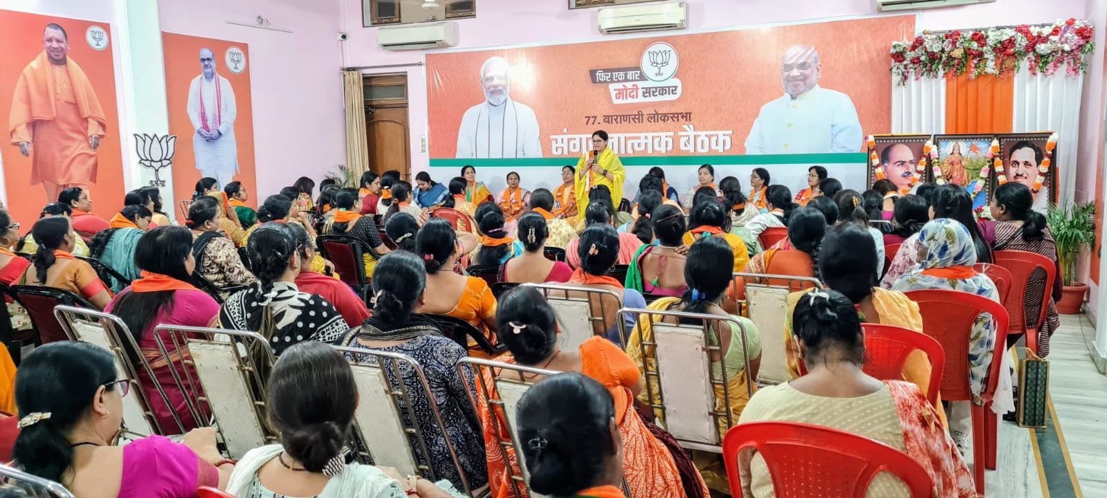 प्रदेश मंत्री व महिला मोर्चा प्रभारी अर्चना मिश्रा ने महमूरगंज स्थित केंद्रीय चुनाव कार्यालय पर आयोजित महिला मोर्चा की बैठक को संबोधित करते हुए कहा कि प्रधानमंत्री के रोड शो में हम महिलाओं ने अपनी जिम्मेदारी को बखूबी निभाया। परिणाम स्वरूप प्रधानमंत्री अत्यंत प्रसन्न हुए और उन्होंने अपनी प्रसन्नता को मंच से जाहिर भी किया। कहा कि पीएम मोदी का पुनः काशी आगमन विशेष रूप से हम माताओं बहनों का आभार व्यक्त करने के लिए ही हो रहा है। इसलिए हम माताओं बहनों की जिम्मेदारी और भी बढ़ जाती है। कहा कि मातृशक्ति सम्मेलन में ज्यादा से ज्यादा महिलाएं सम्मिलित हों इसकी चिंता हम सभी को करनी है।