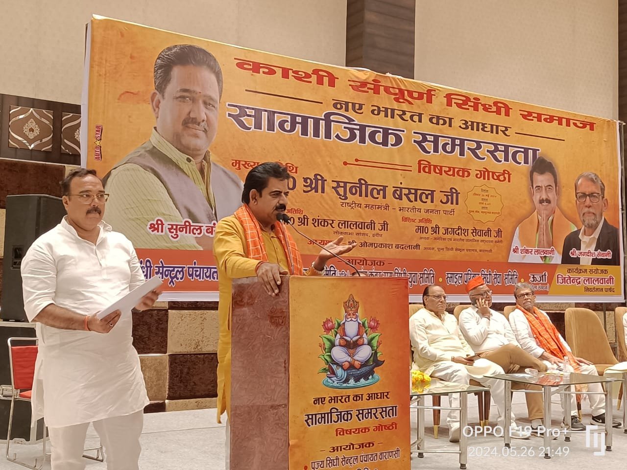“नए भारत का आधार सामाजिक समरसता विषयक पर काशी के सम्पूर्ण सिंधी समाज द्वारा महमूरगंज स्थित शुभम लान में संगोष्ठी का आयोजन हुआ। संगोष्ठी में सिंधी समाज ने 1 जून को होने वाले चुनाव में शत-प्रतिशत मतदान का संकल्प लिया।संगोष्ठी में मुख्य अतिथि के रुप में भाजपा के राष्ट्रीय महामंत्री सुनील बंसल, विशिष्ट अतिथि के रुप में इंदौर के सांसद शंकर लालवानी एवं जगदीश सेवानी ( अध्यक्ष अमेरिकी एवं भारतीय सामाजिक सद्भावना कमेटी) रहे।संगोष्ठी को संबोधित करते मुख्य अतिथि सुनील बंसल ने राष्ट्रनिर्माण में सामाजिक समरसता किस प्रकार आधार बने इस विषय पर सविस्तार अपने उद्गार व्यक्त किए। उन्होंने कहा कि जिस प्रकार पुरूषार्थ के बल पर सिंधी समाज ने सदैव राष्ट्रनिर्माण में अपना योगदान दिया है नए भारत के निर्माण में भी अग्रसर रहेंगे।