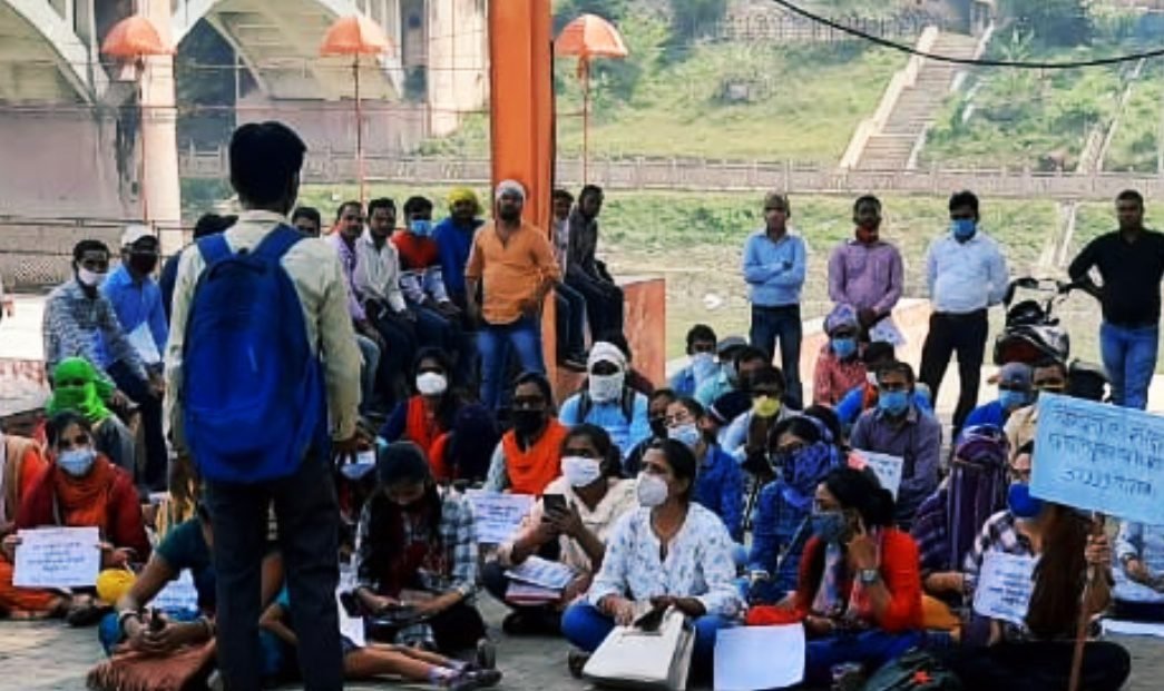 नियुक्ति की मांग को लेकर भावी शिक्षकों ने शास्त्री घाट पर दिया धरना