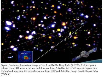एयूडीएफएस01 आकाशगंगा के रहस्योद्धाटन और भारी आकृतिविग्यान का पहला उदाहरण है। इस आकाशगंगा में चार गुच्छे हैं और, शायद, इस रेडशिफ्ट रेंज में स्टार बनाने वाली आकाशगंगाओं की खासियत है। एयूडीएफ-दक्षिण (एयूडीएफएस) के वर्तमान संस्करण का उपयोग रेडशिफ्ट 1 और 2 से कई ऐसी ईयूवी आकाशगंगाओं का पता लगाने के लिए किया जा सकता है, जब कॉस्मिक सितारो के बनने की दर अपने चरम पर थी, और इस तरह, एस्ट्रोसैट परिदृश्य को लौकिक पुनर्मिलन को परिष्कृत करने की अनुमति दे सकता है। । “जब प्रौद्योगिकी अक्सर विकसित होती है और स्थानीय आवश्यकताओं को ध्यान में रखते हुए अपनाई जाती है, रहस्य्पूर्ण विज्ञान को अक्सर मजबूत अंतर्राष्ट्रीय सहयोग और सीईएफआईपीआरए द्वारा समर्थन की आवश्यकता होती है। डीएसटी के सचिव प्रोफेसर आशुतोष शर्मा ने कहा कि वास्तव में 40 देशों के साथ भारत के सक्रिय अंतरराष्ट्रीय सहयोग के कारण कई गंभीर कहानियां मौजूद हैं।