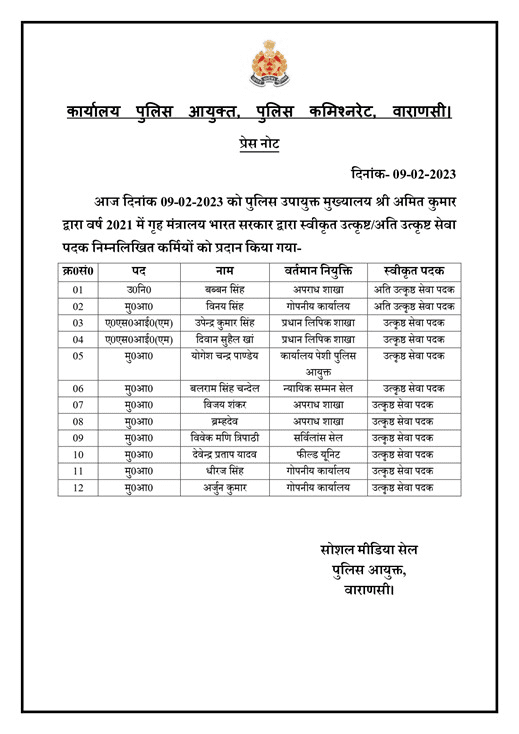 वाराणसी। गृह मंत्रालय की तरफ से उत्कृष्ट व अति उत्कृष्ट सेवा के लिए 12 पुलिस कर्मियों को सम्मानित किया गया। गुरुवार को पुलिस उपायुक्त मुख्यालय अमित कुमार ने बताया कि अपराध शाखा के उपनिरीक्षक बब्बन सिंह को अति उत्कृष्ट सेवा पदक, मुख्य आरक्षी विनय सिंह को  अति उत्कृष्ट सेवा पदक मिला जबकि उपेंद्र कुमार सिंह, दिवान सुहैल खां, योगेश चंद्र पांडेय, बलराम सिंह चंदेल, विजय शंकर, ब्रह्मदेव, विवकेमणि त्रिपाठी, देवेंद्र प्रताप यादव, धीरज सिंह और अर्जुन कुमार को उत्कृष्ट सेवा पदक से सम्मानित किया गया।