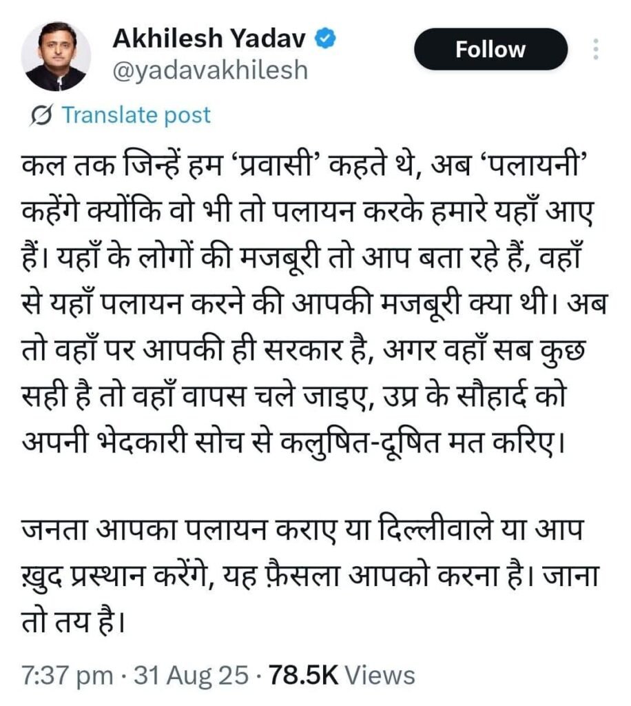 वाराणसी। समाजवादी पार्टी के अध्यक्ष अखिलेश यादव द्वारा उत्तर प्रदेश विधानसभा में 14 अगस्त 2025 को मुख्यमंत्री योगी आदित्यनाथ को *“प्रवासी मुख्यमंत्री”* कहे जाने के बयान पर भारतीय जनता पार्टी विधि प्रकोष्ठ, काशी क्षेत्र के संयोजक एवं अधिवक्ता शशांक शेखर त्रिपाठी ने कड़ी प्रतिक्रिया व्यक्त की है।उन्होंने कहा कि अखिलेश यादव का यह बयान न केवल तथ्यात्मक रूप से भ्रामक है, बल्कि भारत की एकता और अखंडता के सिद्धांतों के भी खिलाफ है।