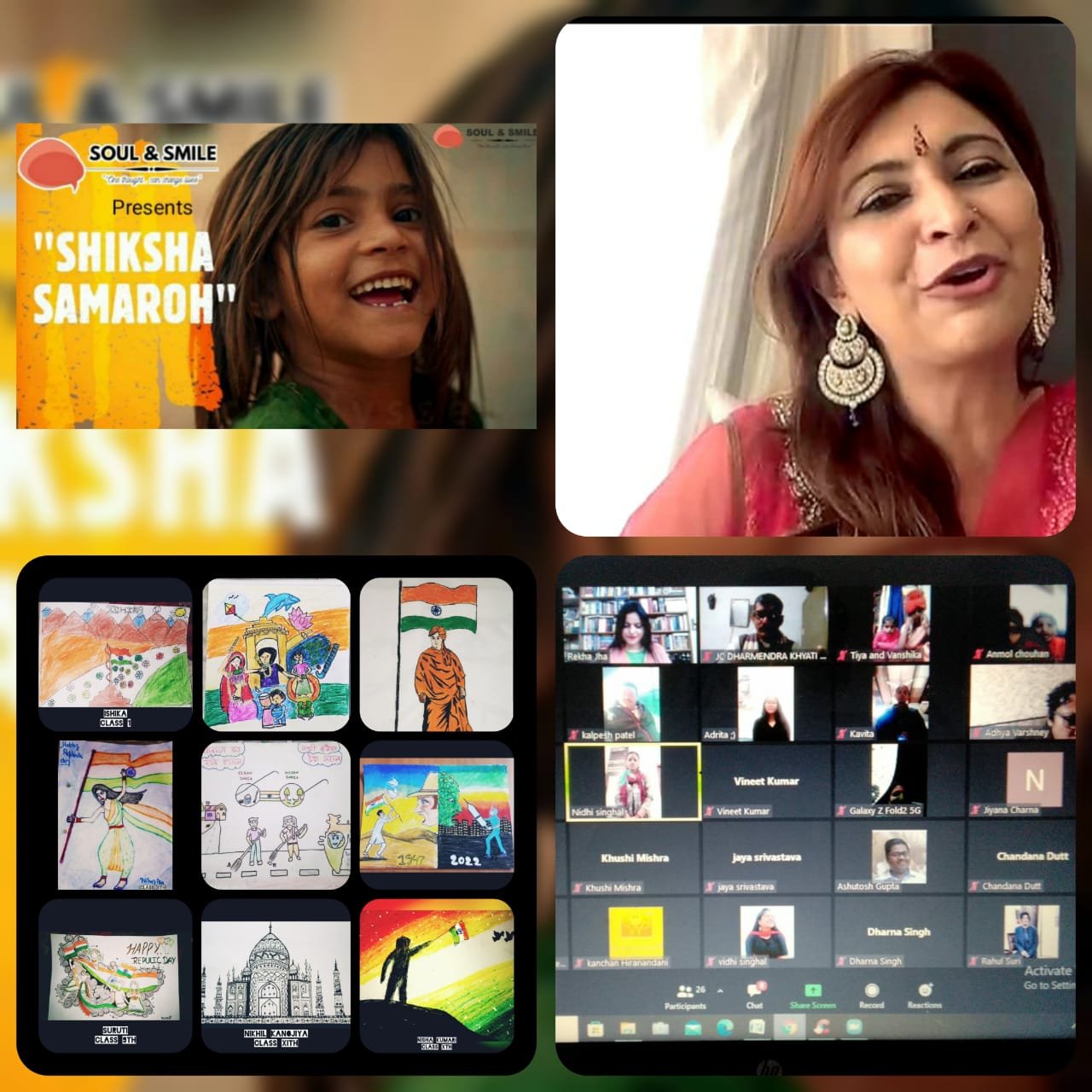 सोल एंड स्माइल प्रस्तुत करता है “शिक्षा समारोह” जूम मीटिंग में वस्तुतः भारत का 73वां गणतंत्र दिवस मनाया गया। शो में मुख्य अतिथि डॉ. उषा रूपनारायण (दक्षिण अफ्रीका की पूर्व संसद सदस्य और साथ ही पावर टू एम्पावर की संस्थापक) और उनकी बहन डॉ सोनिया रूपनारायण थे। इस शो में भारत के विभिन्न राज्यों जैसे नोएडा से सुश्री एकता सहगल मल्होत्रा , सुश्री निधि सिंघल (नोएडा), सुश्री अनीता शर्मा (नोएडा), सुश्री सुरभि शर्मा (इंदिरापुरम), सुश्री नेहज़त (नोएडा) ,कलपेश पटेल जी गुजरात से ,के सूत्रधारों ने भाग लिया। , धर्मेंद्र सर, श्रीमती सीमा मेहता (अलवर, राजस्थान), डॉ. नरदीश (नवी मुंबई), सुश्री कविता, रक्तिमा मित्रा (पश्चिम बंगाल), कंचन हीरानंदानी (दिल्ली), नीतू वार्ष्णेय (नोएडा), रीना सेन (हैदराबाद), डॉ. जया श्रीवास्तव (हैदराबाद) और कुछ छात्र (नोएडा, गुजरात, बिहार और राजस्थान से) जिन्होंने हमारी रगों में देशभक्ति का ईंधन भर दिया।