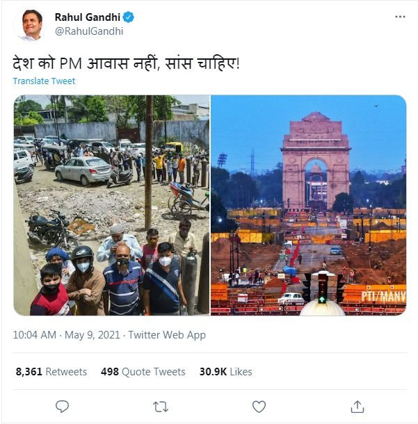 राहुल ने ट्वीट कर कहा कि `देश को पीएम आवास नहीं, सांस चाहिए!` इससे पहले केंद्रीय विस्टा परियोजना को `आपराधिक अपव्यय` करार देते हुए राहुल गांधी ने शुक्रवार को नरेंद्र मोदी सरकार से लोगों के जीवन पर अधिक ध्यान केंद्रित करने का आग्रह किया।