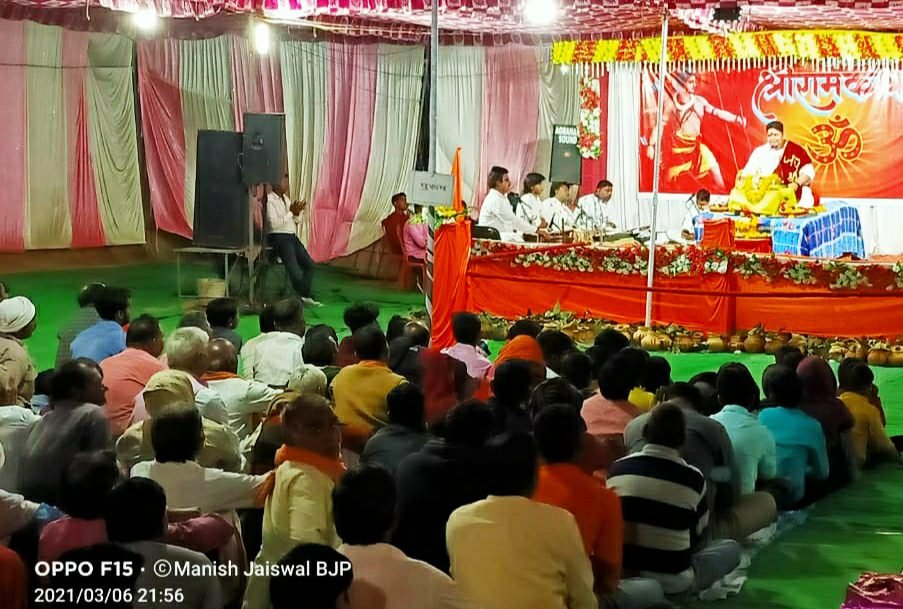 जब वृंदावन के रमण बिहारी के मंदिर में भक्तों का निश्चल मिलन का सजीव यथार्थ चित्रण कर भक्तों द्वारा मोजा, पजामा,कुर्ता बनवा कर लेकर भक्तों पहनाने अपने भगवान को जाता है। महिला को हर लोग पागल समझकर पहले ठिठोली करते हैं फिर बाद में पुजारी को एहसास होता है कि भगवान तो भक्त के भूखे होते हैं और जब भगवान ने कुर्ता पजामा धारण किया जिसका आज भी चर्चा वृंदावन में होता है। जैसे सजीव कथा का रसपान कराकरभक्तों को भाव विभोर कर दिया।साथ में भगवान की सुंदरता पर खर और दूषण के सम्मोहन के साथ ही साथ – “तेरे बिना मैं एक पल भी जी नहीं सकता ” के विरह वेदना भरी गीत संगीत के माध्यम से मनोरम प्रस्तुति ने श्रोताओं को भक्तिरस में सराबोर कर दिया।कथावाचक श्री भारद्वाज ने संयुक्त परिवार के महत्व को भी रेखांकित किया और संवाद हीनता से दूर रहने की बात श्रोताओं से कही।अपनी वाणी में अमृत घोल राधे राधे बोल के भाव का तबला,बासुरी, हरमोनियम आदि के वाद्य यंत्रों के साथ भगवान की स्तुति एवं श्रीराधा कृष्ण की अनुपम झांकी व अलौकिक शास्त्रीय संगीत मानो साक्षात वृंदावन में रास रचाने के दृश्य प्रतीत हो रहा था।जिसपर भक्तों द्वारा जमकर फूलों की वर्षा एवं डांडिया नृत्य प्रस्तुत की गई। इस मौके पर मुख्य यजमान सपत्नी शांति प्रकाश जायसवाल ने भगवान ठाकुर जी का आरती पूजन किया।इस मौके पर अतिथि सुभाष सिंह, पंडित ह्रदय शर्मा, पंडित तदव्य शर्मा, बच्चा ठाकुर, रजनीश कुमार सिंह , शशीकांत मिश्रा, रविंद्र सिंह, राजन चौधरी, डॉ संजय कुमार, राजेश्वर प्रसाद , दिलीप कुमार पांडेय, सूरज देव, अवधेश जायसवाल, प्रेमचंद आढ़ती , भोलानाथ आढ़ती, आयोजन समिति के मुख्य संयोजक डॉक्टर हर्षवर्धन, धर्म प्रसाद जायसवाल, निरंजन जायसवाल, प्रभाकर प्रजापति, मनीष जयसवाल, शैलेश जयसवाल समेत सैकड़ो श्रद्धालु मौजूद रहे।