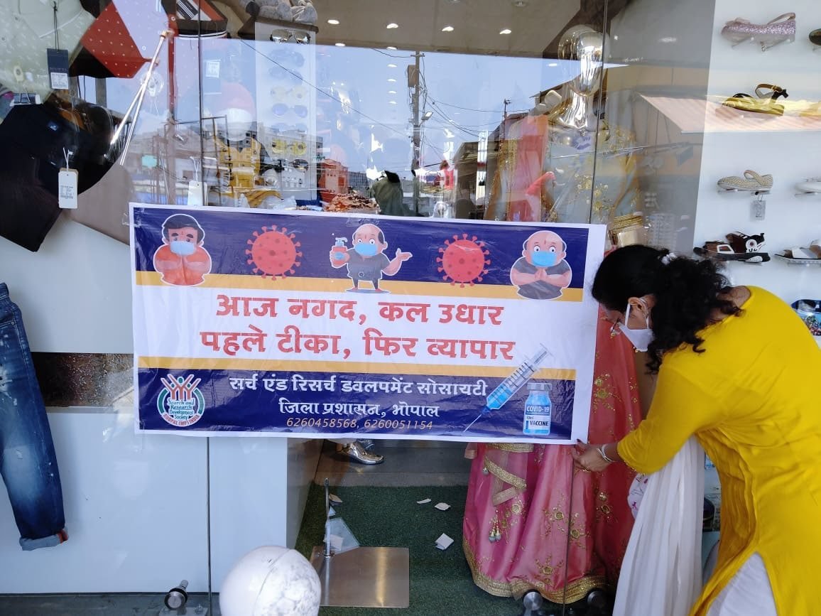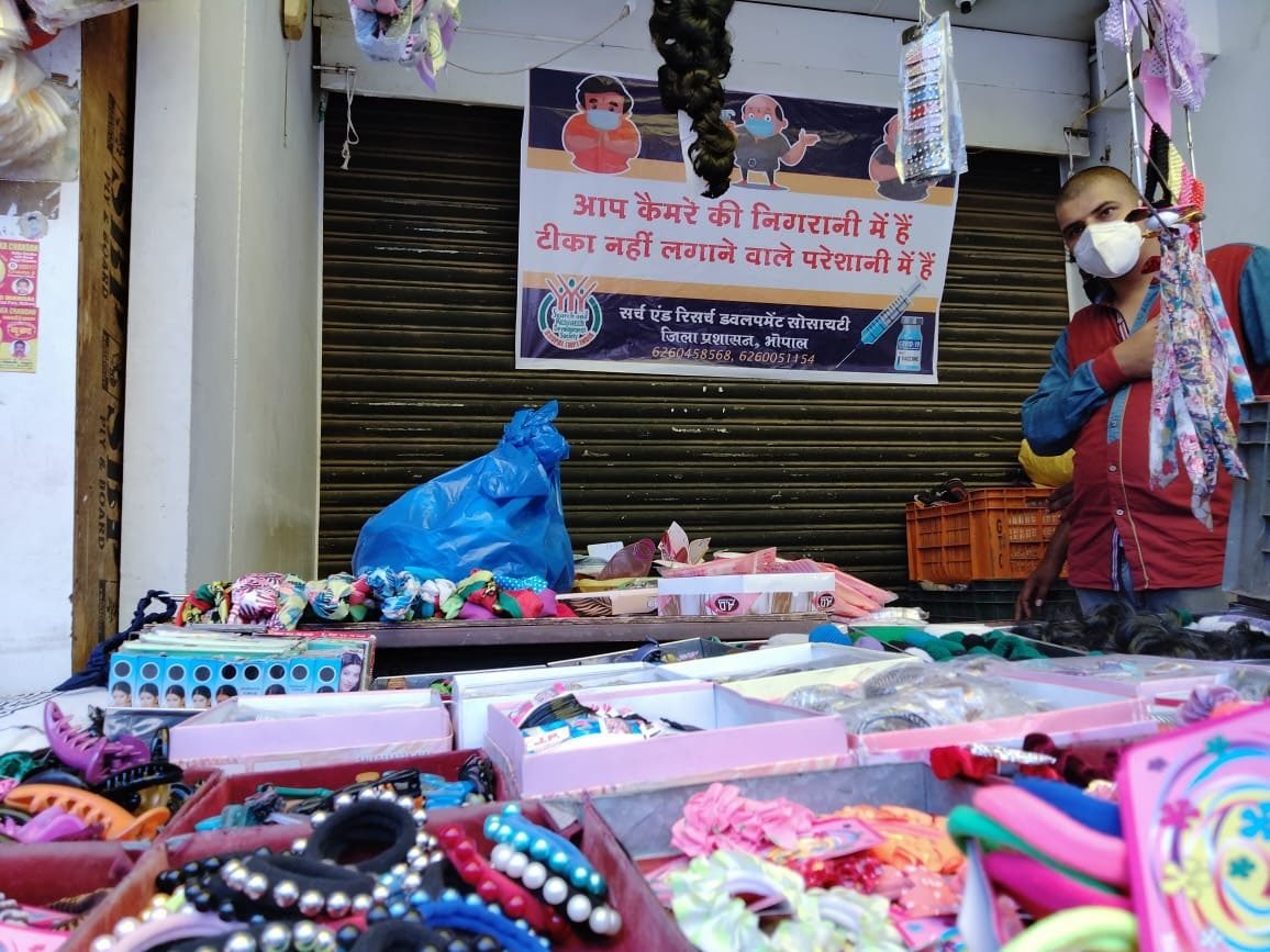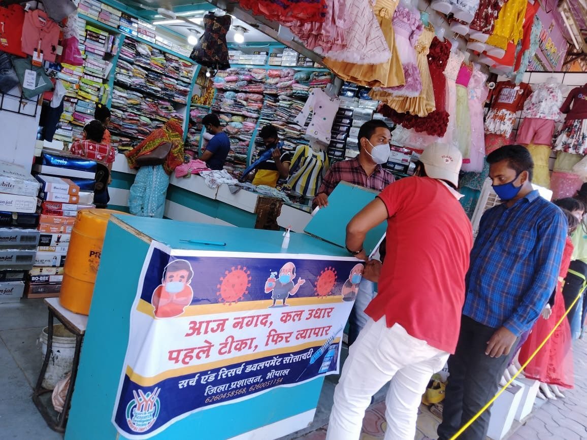 देश के अधिकांश राज्यों में अनलॉक की प्रक्रिया चल रही है। इस बीच सभी को कोरोना से जुड़े नियमों के पालन की सलाह दी जा रही है साथ ही वैक्सीनेशन के लिए भी जागरूक किया जा रहा है। लोगों को वैक्सीनेशन कराने के लिए प्रेरित और जागरूक करने के लिए बाजारों और दुकानों में भी मुहिम चल पड़ी है, जिसका एक नजारा भोपाल में भी देखने के मिला।