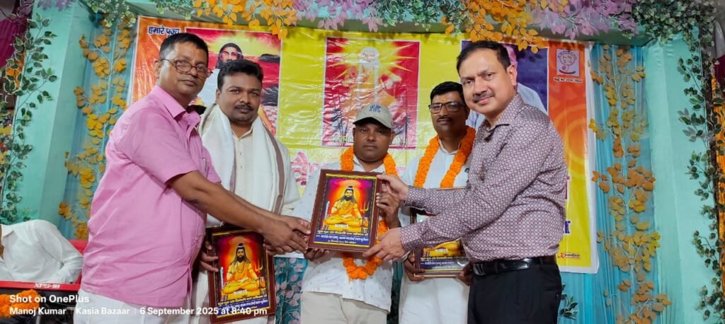 कसया, कुशीनगर। आज कसया नगर स्थित मध्यदेशीय वैश्य महासभा कार्यालय पर कुलगुरु संत शिरोमणि बाबा गणिनाथ जी का पूजनोत्सव बड़े ही हर्षोल्लास एवं धूमधाम से मनाया गया। इस अवसर पर न केवल पूरे जनपद बल्कि आसपास के जनपदों से भी बड़ी संख्या में श्रद्धालु और समाज के लोग उपस्थित हुए। कार्यक्रम की शुरुआत बाबा गणिनाथ जी की स्तुति और पूजन से हुई। भजन गायक सन्नी सांवरिया की मधुर भजनों की प्रस्तुति और राधा-कृष्ण की जीवंत लीला ने उपस्थित जनमानस का मन मोह लिया। पूरा वातावरण भक्ति और आध्यात्मिक रस में डूब गया।